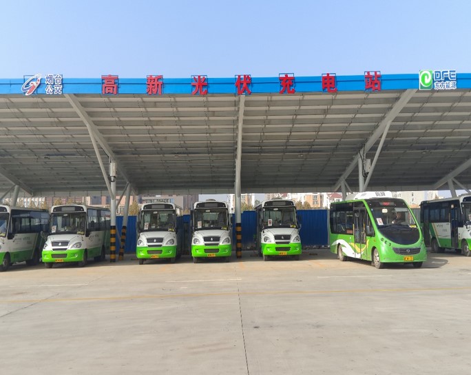 Yantai Dongfang Energy Technology Co., Ltd. and Yantai Public Transport Group Co., Ltd. jointly invest and construct distributed PV + charging pile public transport stations. An electric vehicle parking and charging area sized about 2502 m2 is provided in the High-tech zone bus station yard. At present, the charger station sheds are used to construct 400 kWp distributed photovoltaic system. About 1,500 PV panels are arranged on each shed roof with a total investment of RMB 3 million. The PV capacity is about 400 kWp and the annual power generation is about 450,000 kWh.