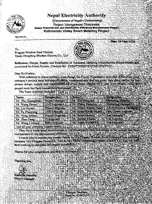尼泊尔AMI项目结束了当地人工抄表的落后状态,极大改善了尼泊尔电网结构及用电质量,提高企业营收,主流媒体报道称,该项目开启了尼泊尔的智能电网新时代!威思顿海外项目团队凭借着过硬的技术水平、一流的执行能力和出色的服务质量获得了尼泊尔国家电力局的高度认可。2021年底尼泊尔国家电力局主动向威思顿发来项目增补邀请及感谢信,感谢威思顿对尼泊尔国家电力局的大力支持和为尼泊尔电力事业发展做出的突出贡献,这不仅是对威思顿AMI项目产品和系统解决方案的认可,更是对威思顿“创新驱动,服务全球”精神的高度肯定!